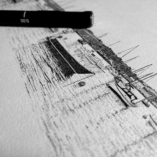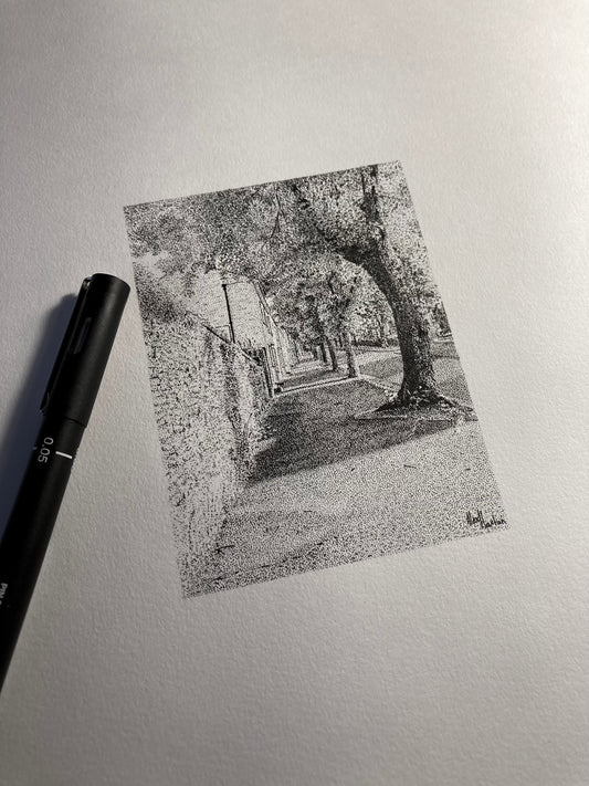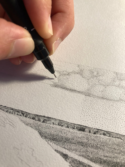 Working in monochrome pointillism, Alex’s drawings begin with a camera walk through the Cornish landscape, later rebuilt dot by dot in the studio. Influenced by light, texture, and atmosphere, his detailed work invites viewers into immersive, meditative spaces.