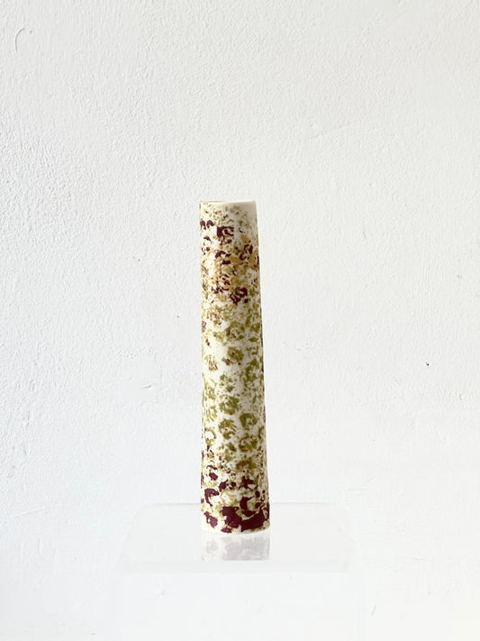 She throws and turns the pieces to a fine finish which, when unglazed and sanded, gives the porcelain a paper-like, tactile quality. Drawing on her design background she applies stains, oxides and slips, splashing or sponging away areas and inlaying lines with movement and spontaneity. Most decorating is done on the wheel to try and capture that feeling of movement on a static object and some pieces have the impression of endless landscape paintings wrapping around them.