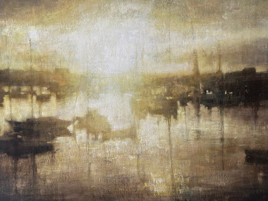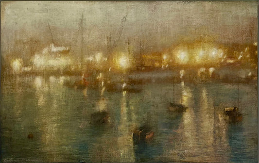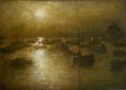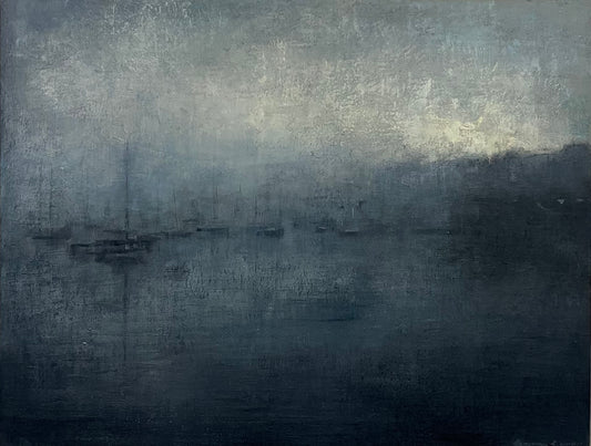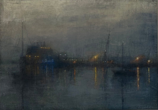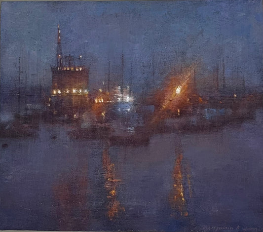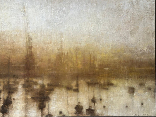 "Falmouth feels like “Home” for me as a painter. It is the place I have painted more than anywhere else. Drawn to the margins of the day, the Docks and Carrick roads really interest me, dusk silhouettes of resting boats, the docks standing proud interspersed with distant glowing lights, just fascinates me. Painting Contre-Jour as the sunrises over Carrick Roads, and the water sparkles, the gulls wake, and the town starts to come to life is just magical. Steeped in all that history, the emotions that are conjured up as dusk moves to dawn, from melancholy to brightness. Not only just visually, but the change in warmth/temperature and sounds just make it seem such a very special place." - Benjamin Warner