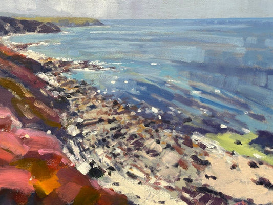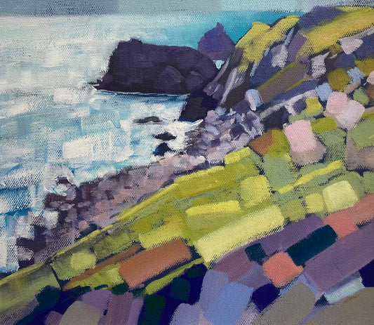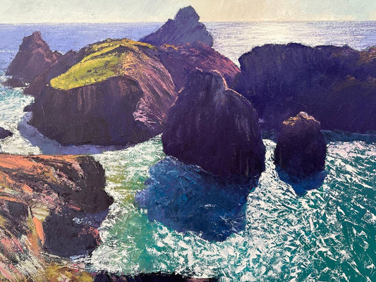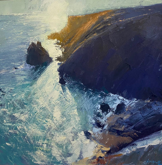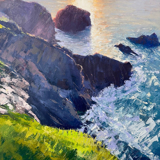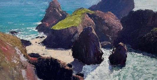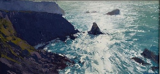 Using only palette knives, Mike paints Cornwall’s coastal cliffs with dense, energetic marks. Trained in Fine Art and based in Cornwall since 1992, his work reflects the motion of wind, sea, and rock, where solid forms meet shifting skies.