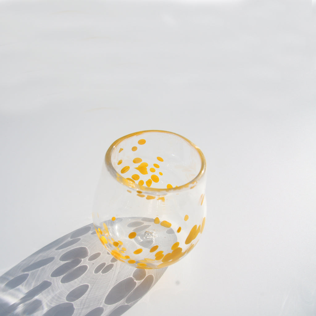 A clear glass with golden yellow inclusions. Each one, like a snowflake, is unique and individual. Nobody will ever have the same glass as you. They are great for juice or water, but equally happy as a G&T or wine glass.